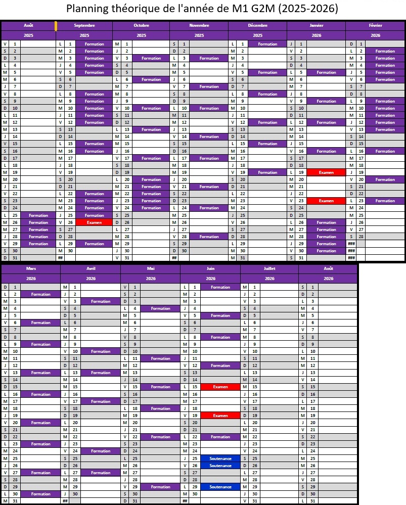 L’année de M1 commence dès la fin août, et se termine fin juin, après les soutenances des mémoires. Le planning théorique ci-dessous vous donne un apperçu de l’organisation de l’année du M1 G2M, entre les jours à l’université (en violet, rouge et bleu) et les jours en entreprises ou en stage (en blanc).