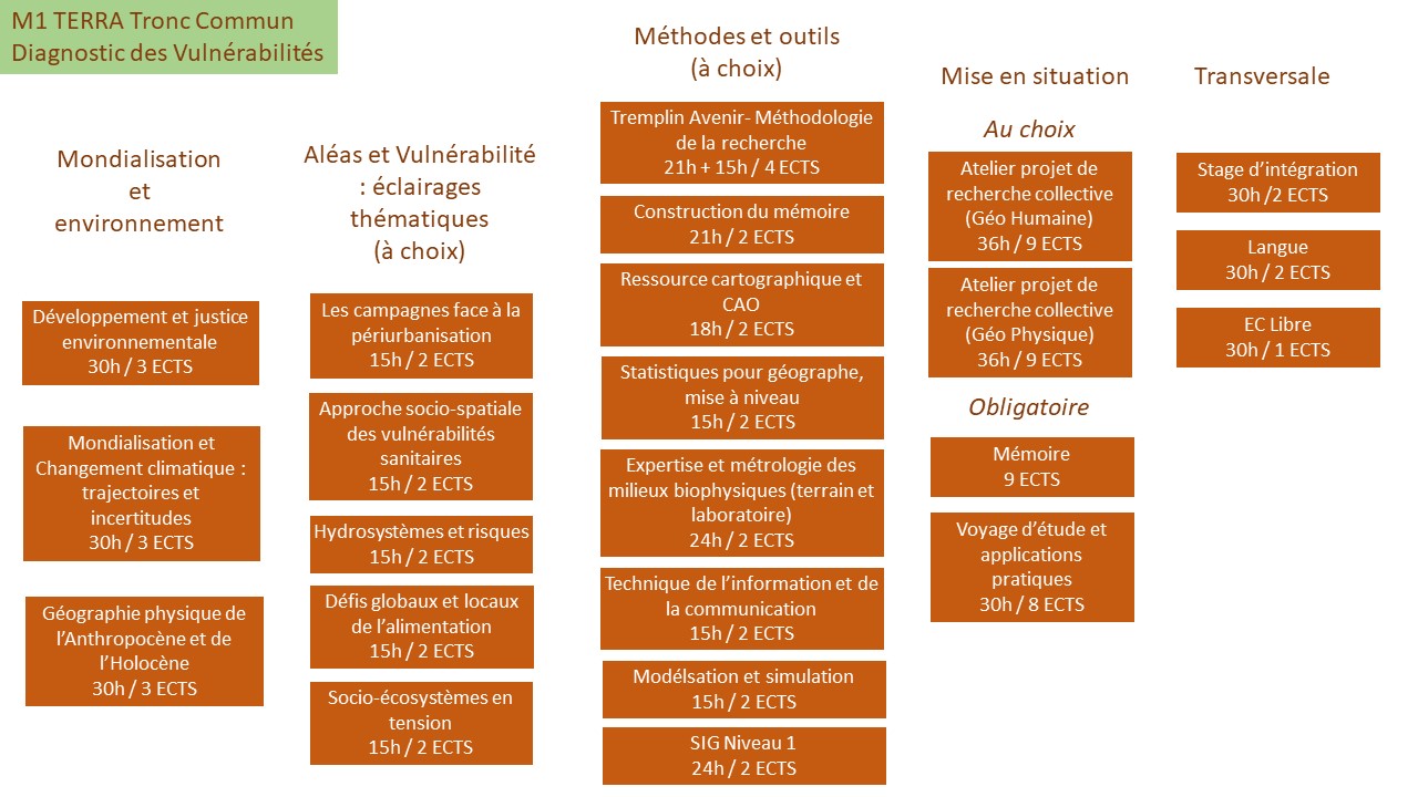 La première année repose sur un tronc commun visant à développer et harmoniser les connaissances. Elle s’adresse aux étudiants issus de Licence de géographie, mais aussi des sciences sociales (sociologie, archéologie, histoire) ou des sciences de l’environnement (biologie, géologie, agronomie).