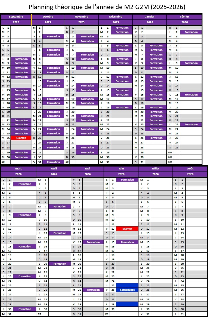 L’année de M2 commence mi-septembre, et se termine fin juin, après les soutenances des mémoires. Le planning théorique ci-dessous vous donne un apperçu de l’organisation de l’année du M2 G2M, entre les jours à l’université (en violet, rouge et bleu) et les jours en entreprises ou en stage (en blanc). En M2, le premier semestre est plus dense à l’université, pour vous permettre, ensuite, d’être davantage disponibles pour vos entreprises, pendant le second semestre.